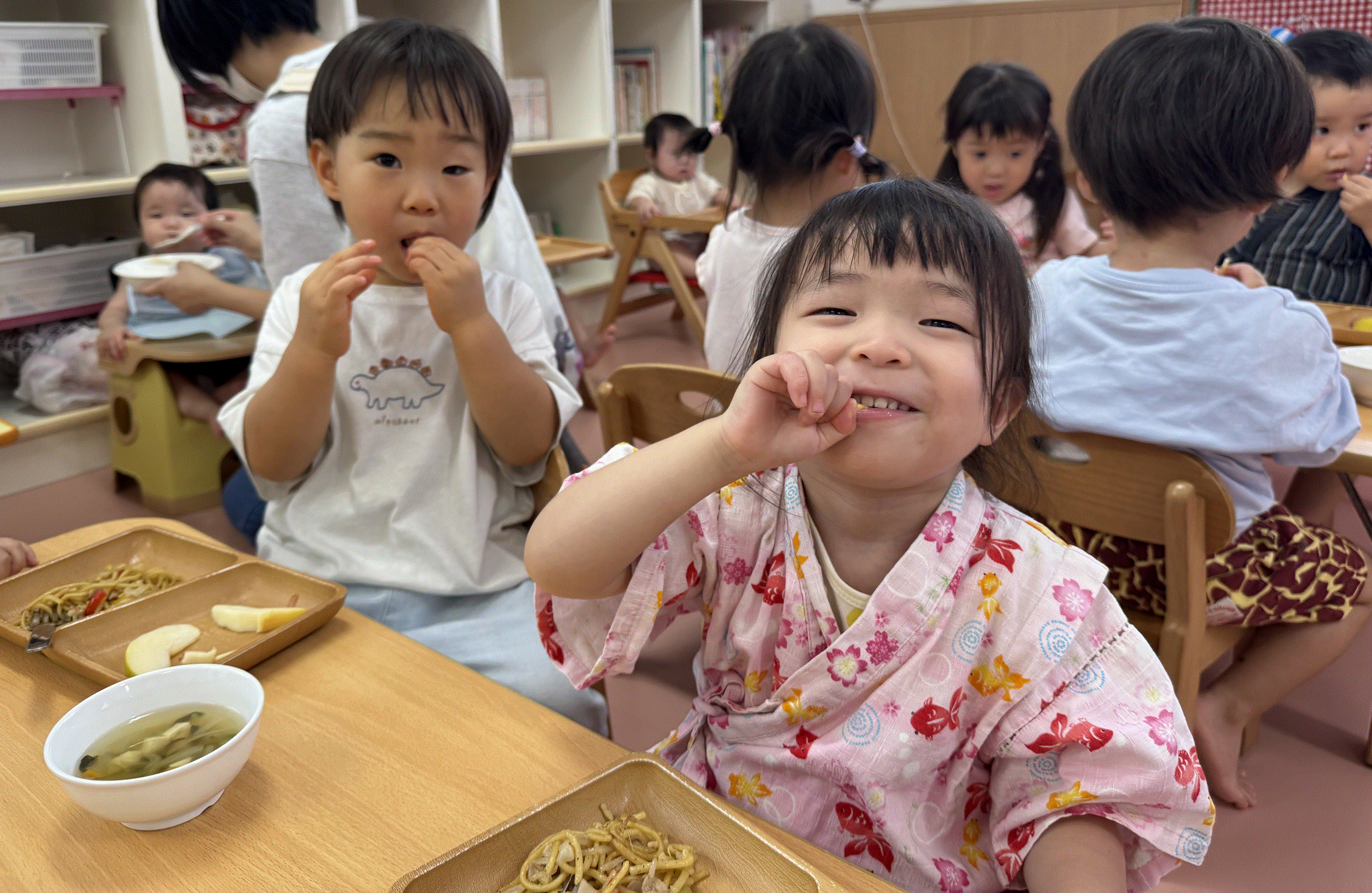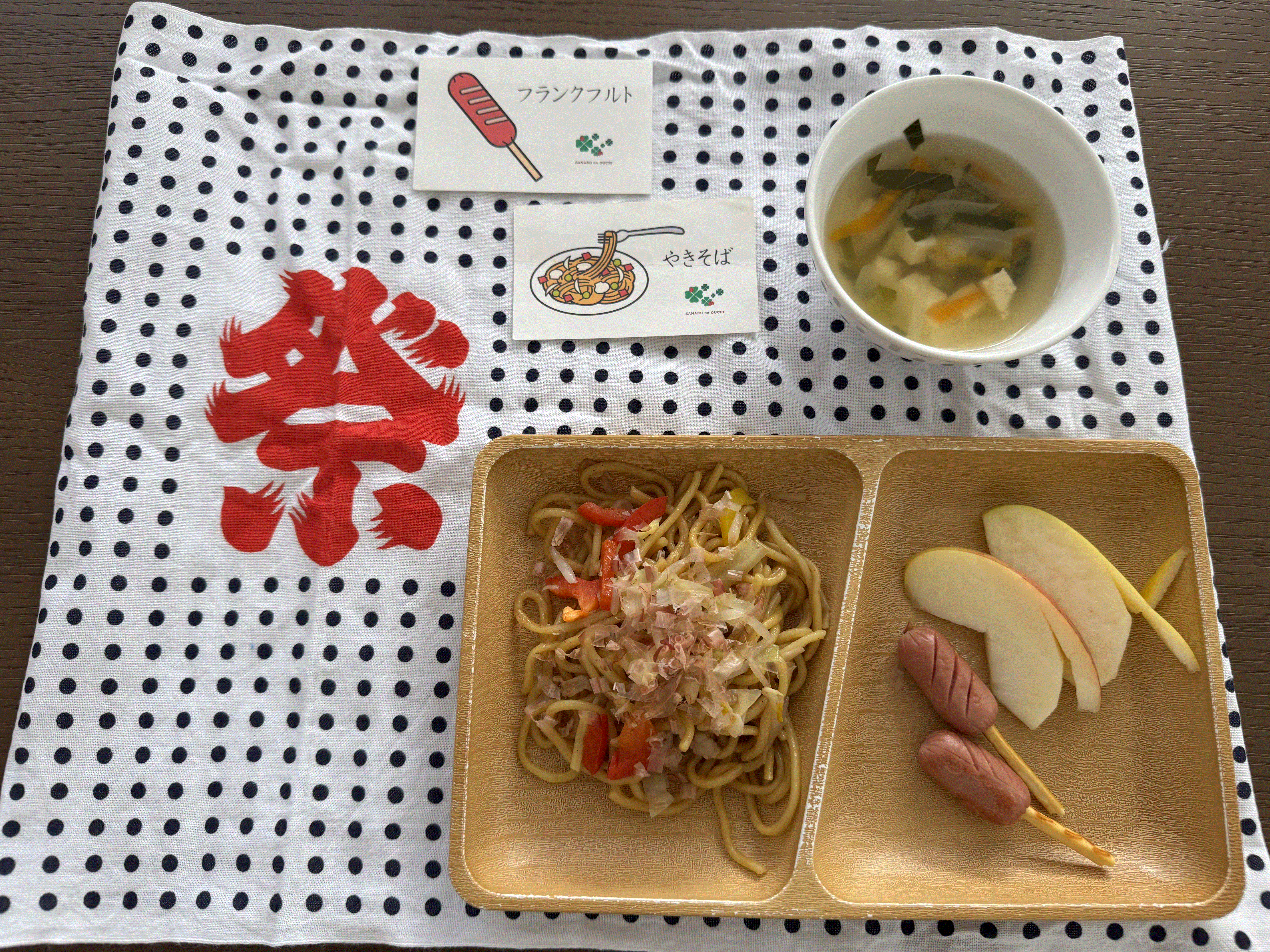 10月の行事食はお祭り給食🍴法被や甚平を着て楽器を鳴らし、お祭りの雰囲気を楽しみました😆給食では焼きそばやフランクフルトなどお祭りメニュをいただき、楽しい思い出ができました!