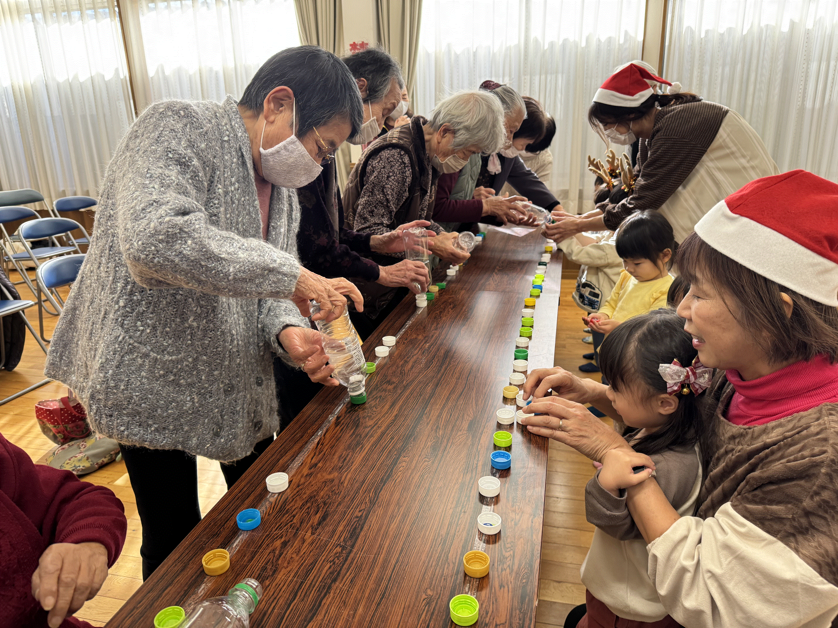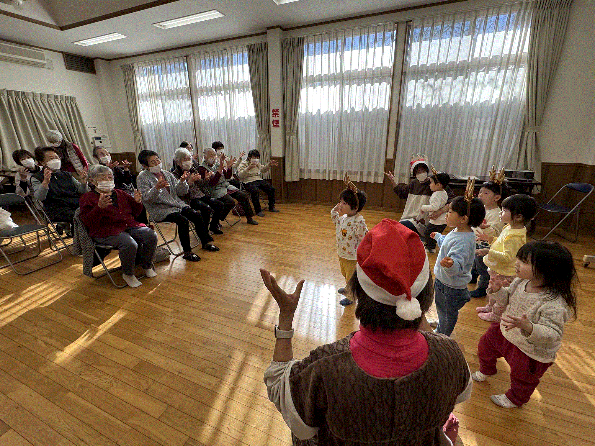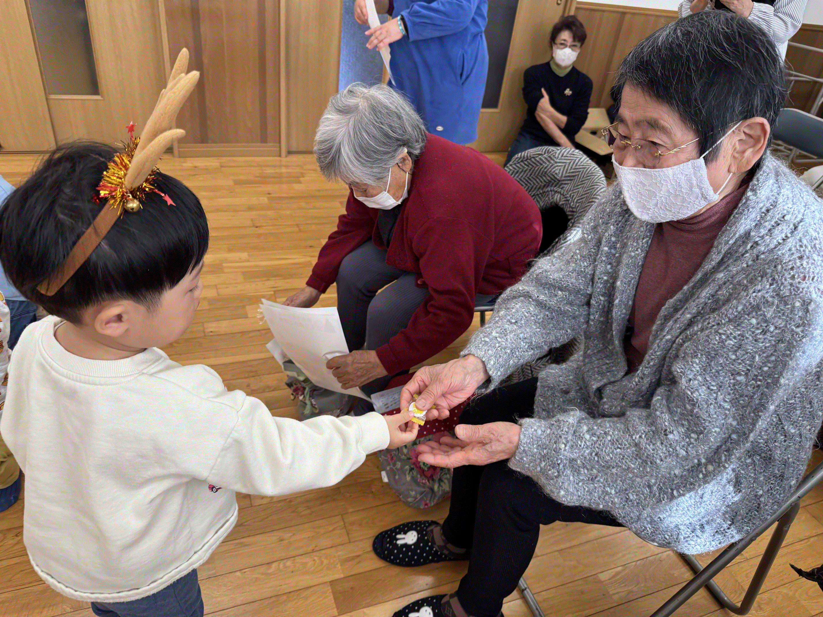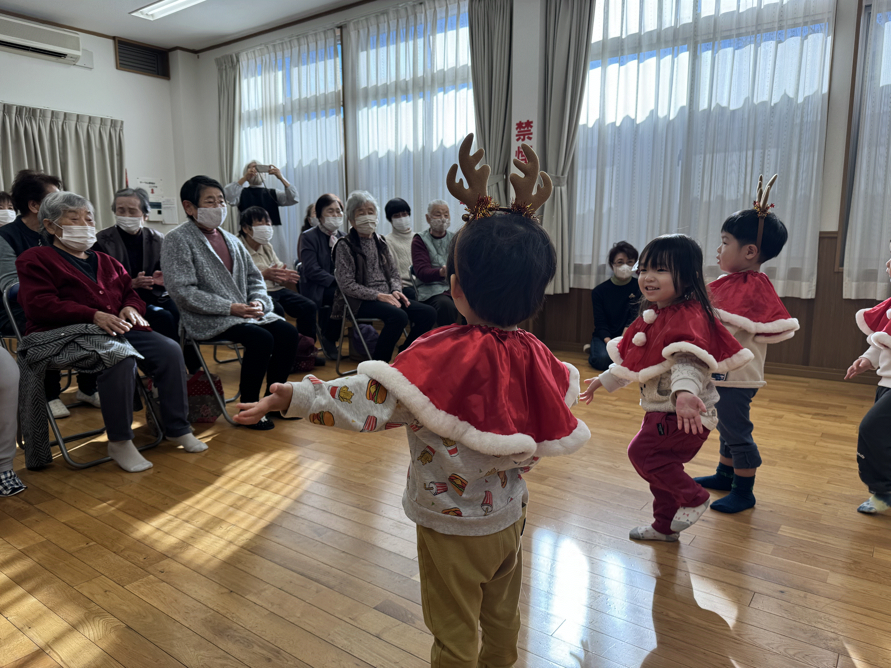 田端・道陸地合同高齢者サロンへ行ってきました✨おじいちゃん、おばあちゃんの温かい眼差しの中、かわいい衣装を着て『サンタが街にやってくる』のお遊戯を披露しました😊少し緊張した様子のにじ組さん達でしたが拍手で迎えられると嬉しそうな表情を浮かべ、のびのびと踊ることができました🎵その後は一緒にゲームをしたり、『きらきらぼし』を歌ったり、おやつを食べたり・・・心温まる素敵な時間を過ごすことができました💗