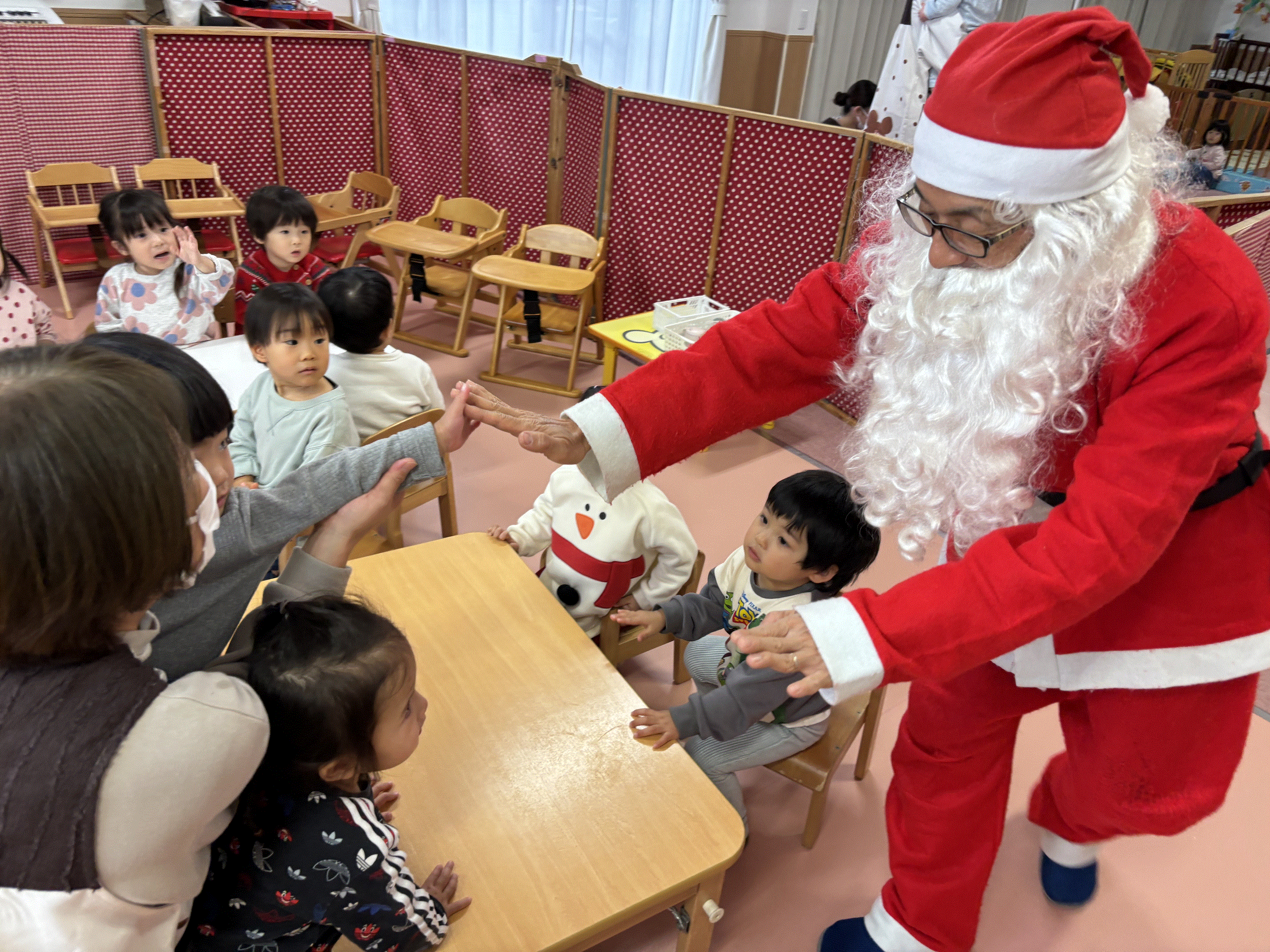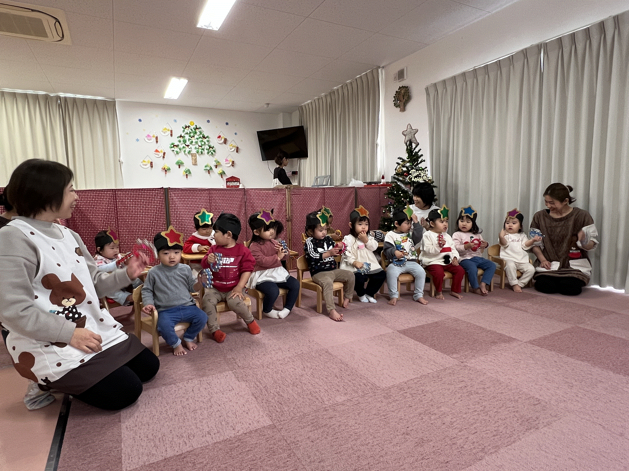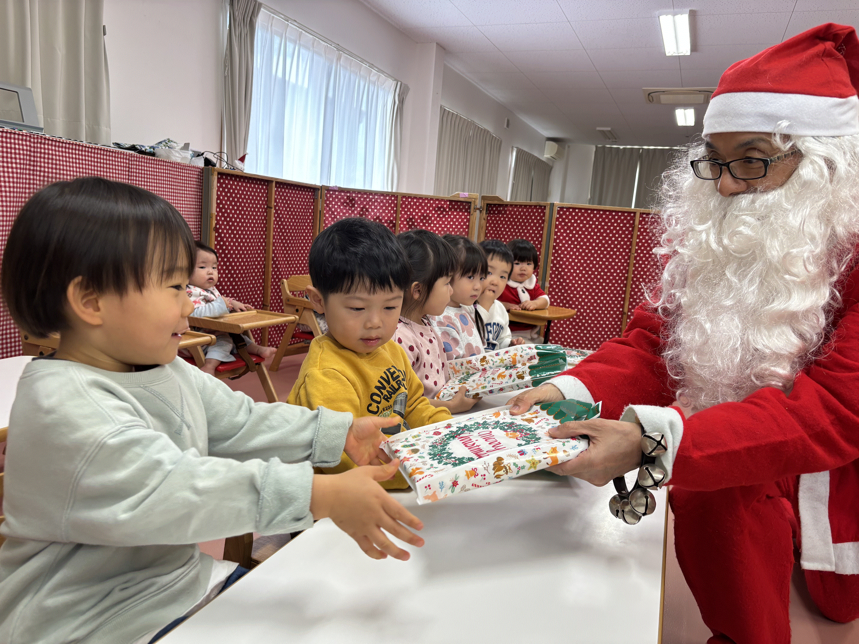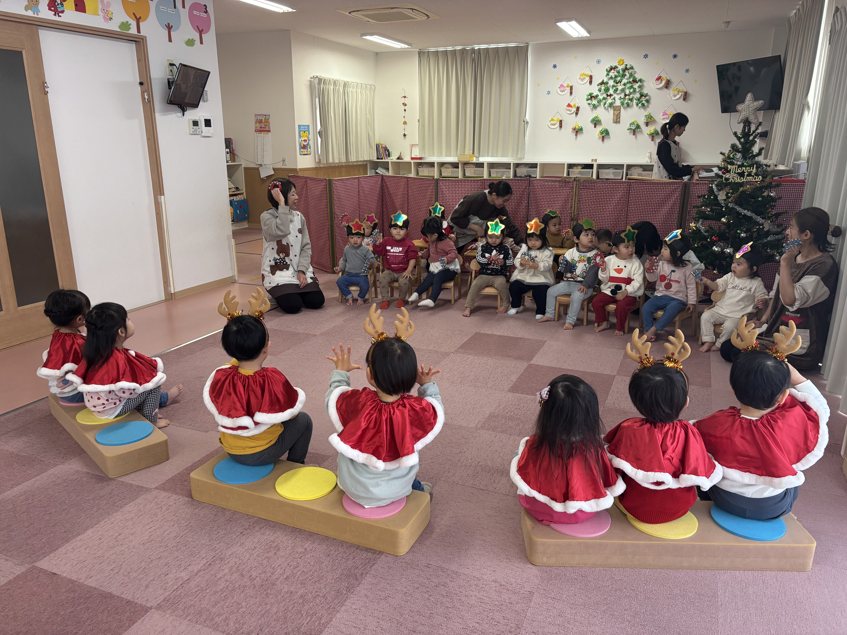 毎日アドベントカレンダーを開けながらクリスマスを楽しみにしていた子どもたち😊クリスマス会当日はにじ組さんは『サンタが街にやってくる』のお遊戯を、そら組さん、ひかり組さんは鈴を使って『きらきら星』の合奏を披露し、子どもたちや先生に見守られながら楽しむことができました✨その後サンタさんが登場すると驚いた表情を見せる子もいましたが、サンタさんがみんなが笑顔になる魔法をかけてくれ、一緒に触れ合いを楽しみました🎅プレゼントをもらうと「ありがとう🎵」と笑顔を見せ楽しい時間を過ごすことができました🎁
