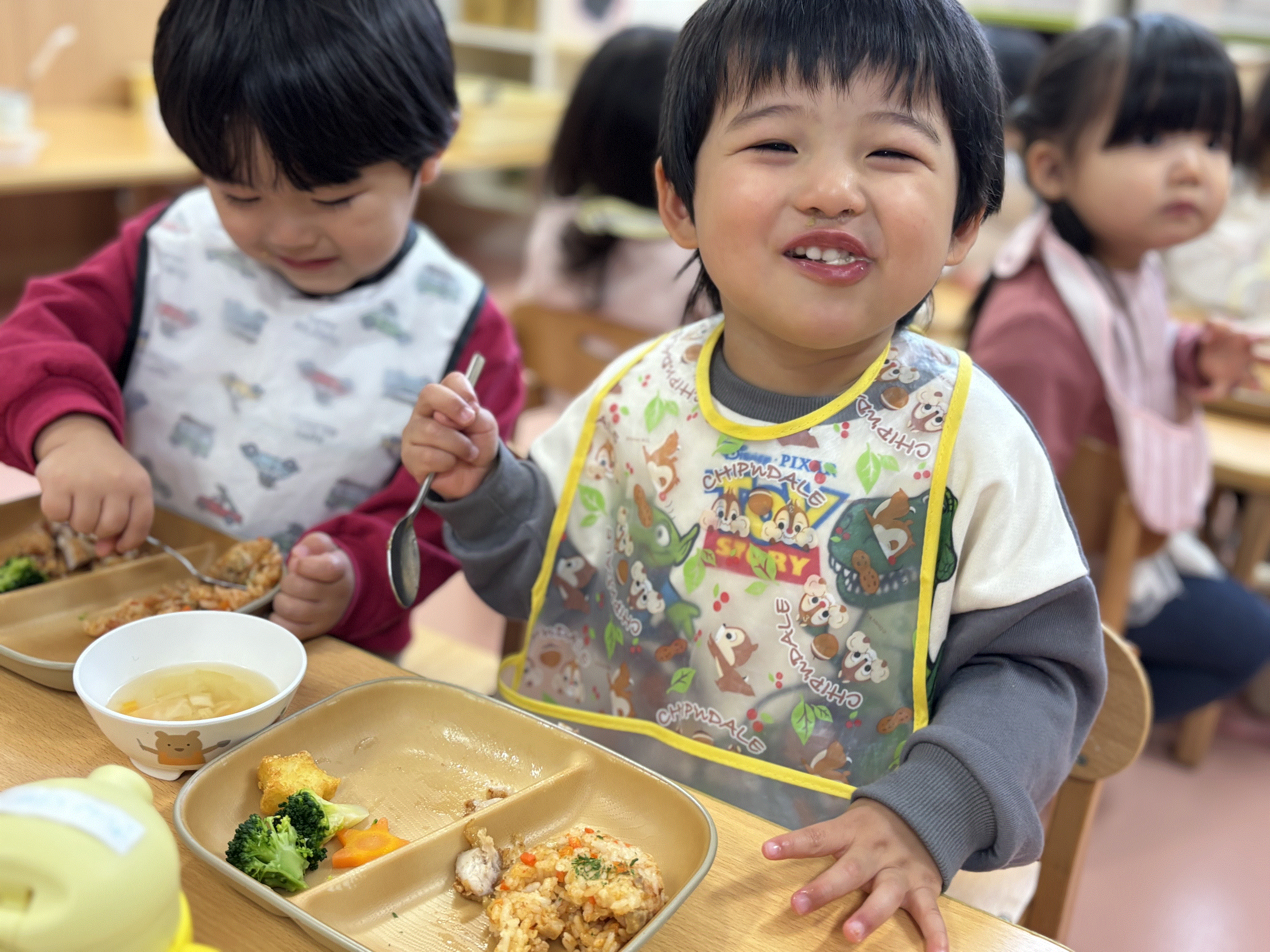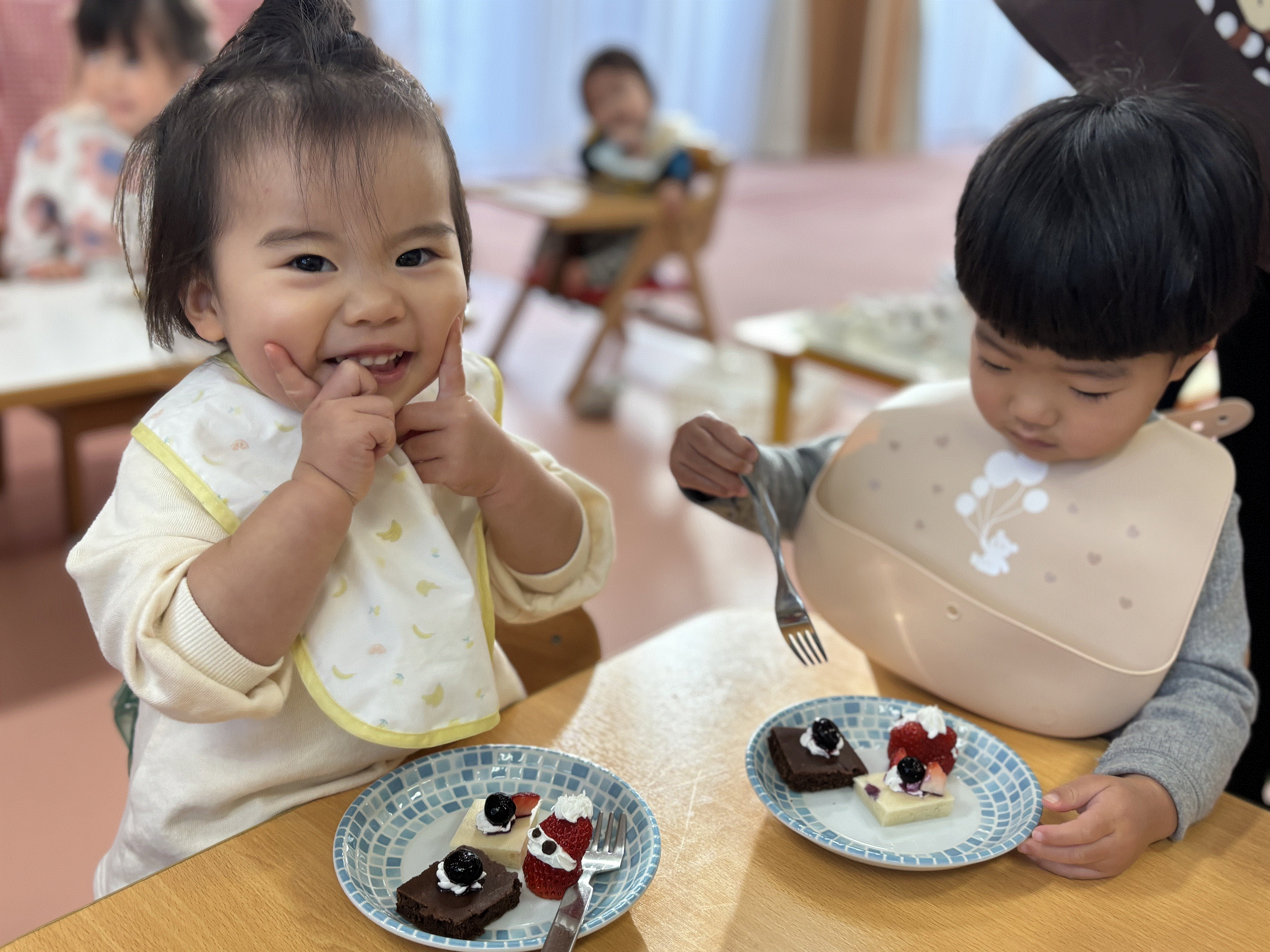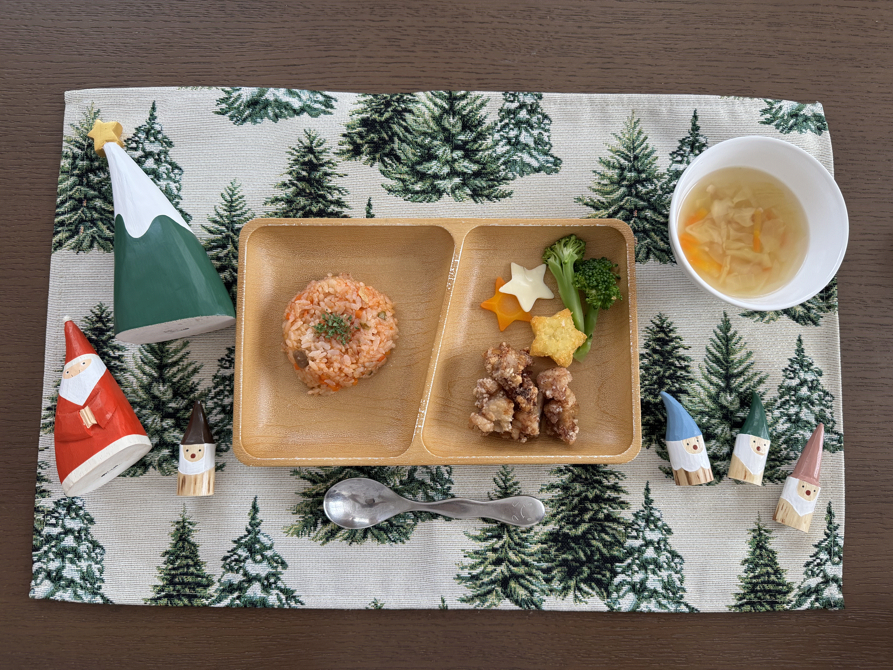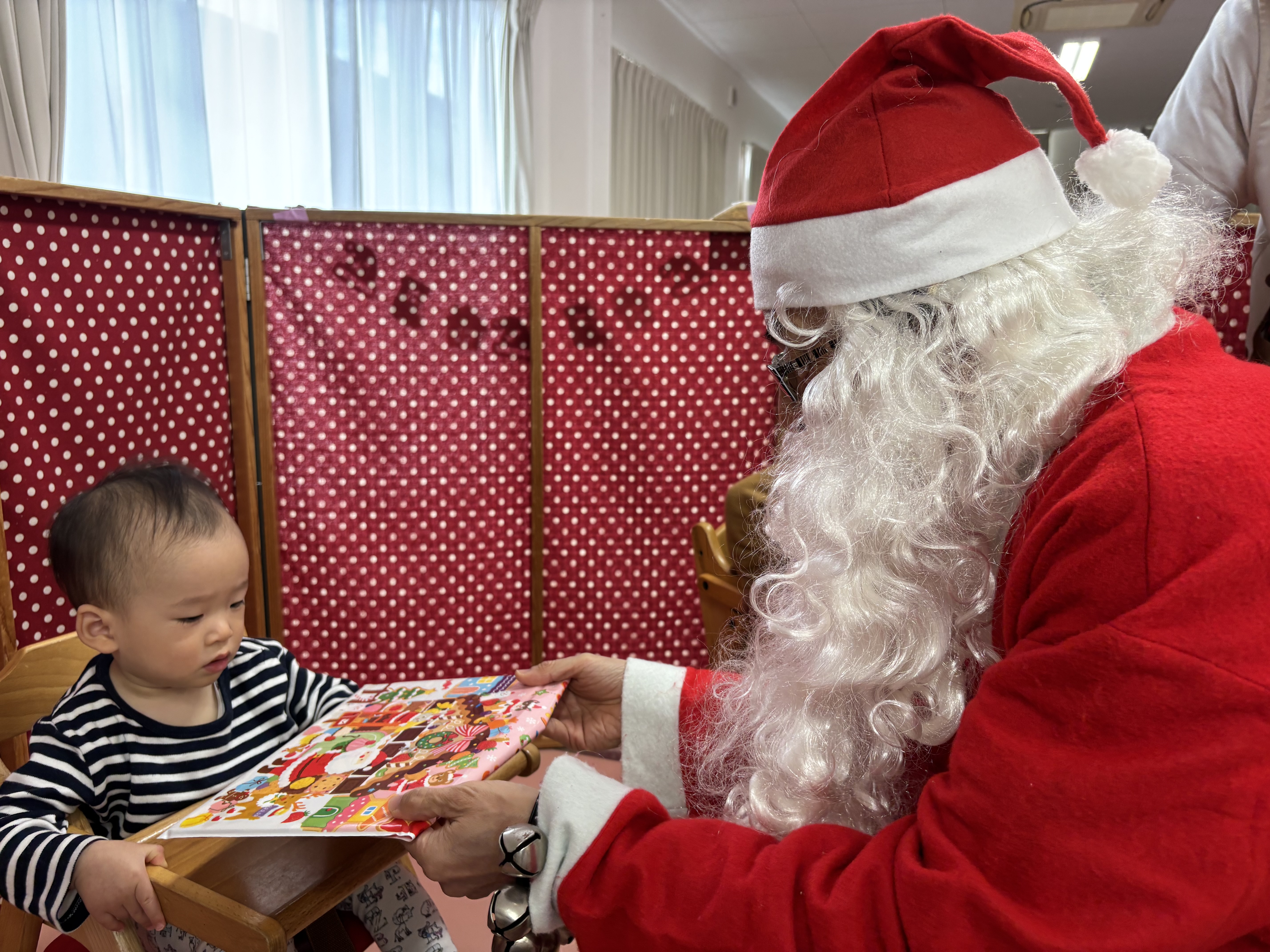 毎日アドベントカレンダーを開けながらクリスマスを楽しみにしていた子どもたち😊クリスマス会当日はにじ組さんは『サンタが街にやってくる』のお遊戯を、そら組さん、ひかり組さんは鈴を使って『きらきら星』の合奏を披露し、子どもたちや先生に見守られながら楽しむことができました✨その後サンタさんが登場すると驚いた表情を見せる子もいましたが、サンタさんがみんなが笑顔になる魔法をかけてくれ、一緒に触れ合いを楽しみました🎅プレゼントをもらうと「ありがとう🎵」と笑顔を見せ楽しい時間を過ごすことができました🎁