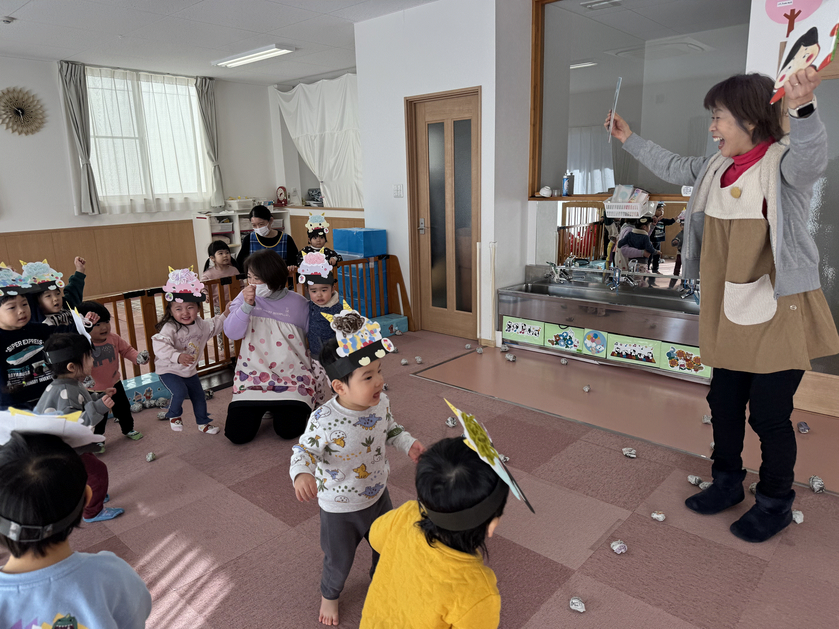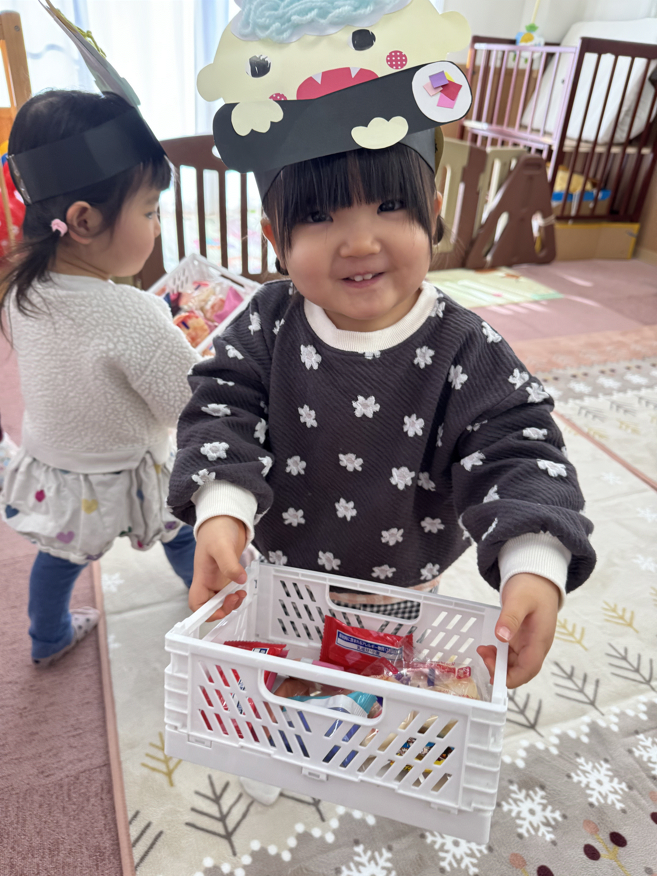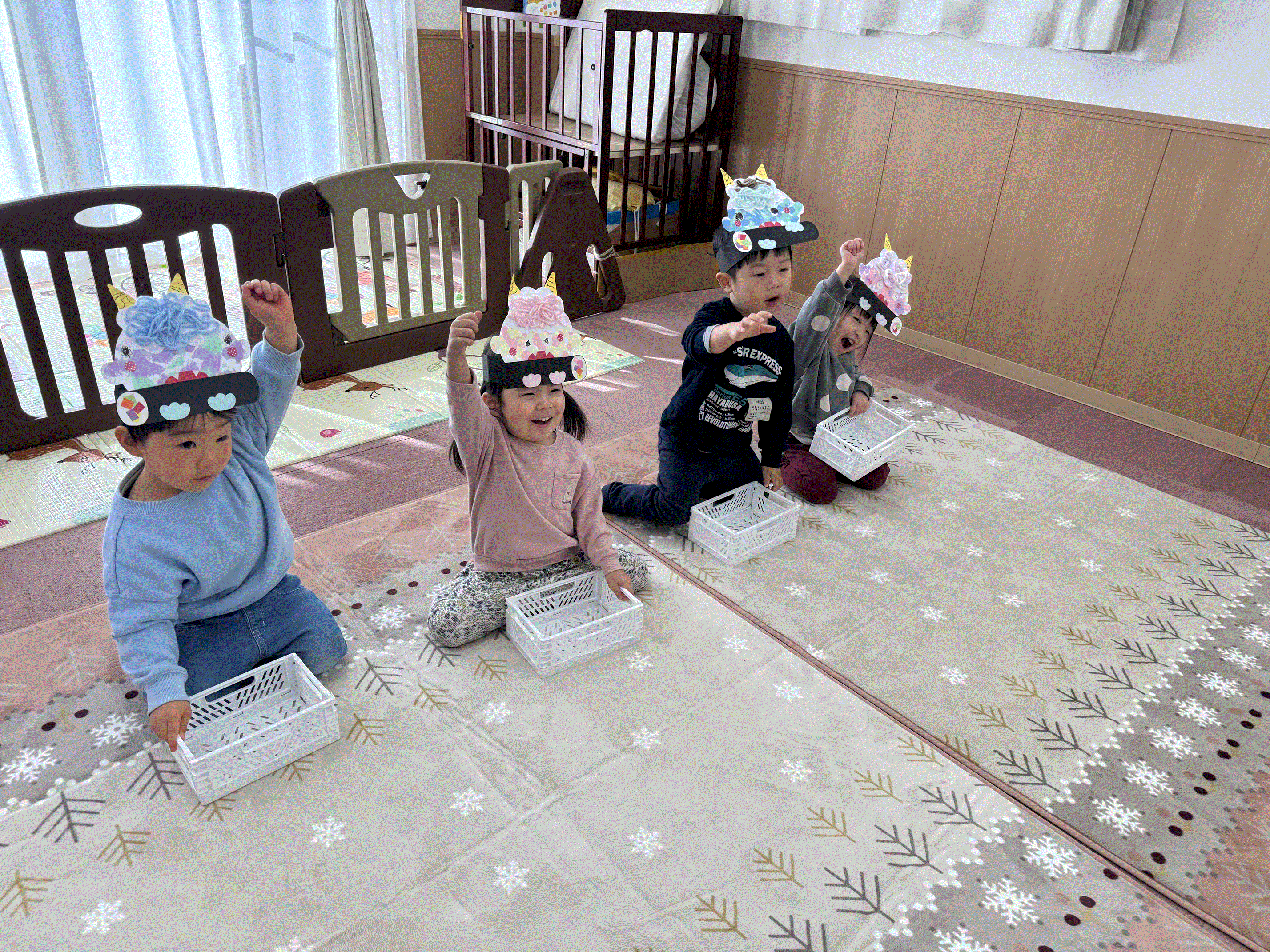 保育園で豆まき会を行いました😊豆まきのお話のパネルシアターを観たり、手作りのお面をかぶって『鬼のパンツ♪』を踊ったり、みんなで節分の行事を楽しみました✨鬼が登場すると驚いた様子でしたが、「鬼は外~!福は内~!」と新聞紙の豆を投げ、鬼が去り福の神がやってくると笑顔を見せてくれた子どもたちです🎵その後お菓子拾いもにこにこで参加し、お楽しみ給食のかわいい鬼ランチ👹も美味しく食べ、節分の行事を楽しく過ごしました🌟