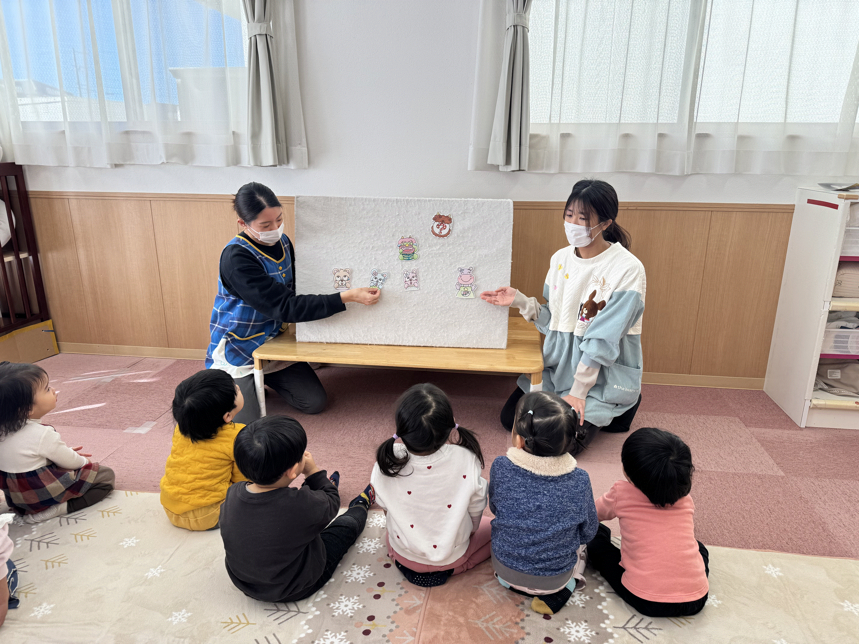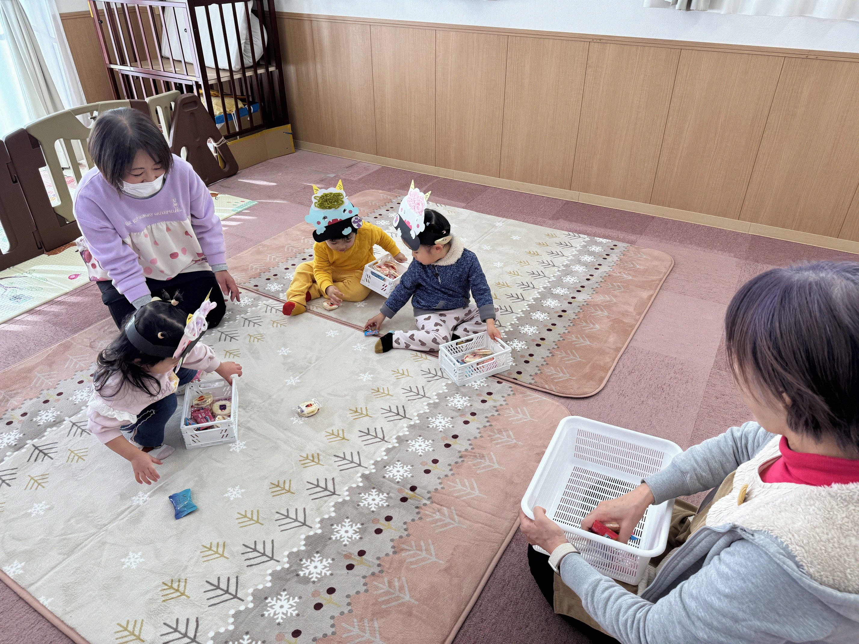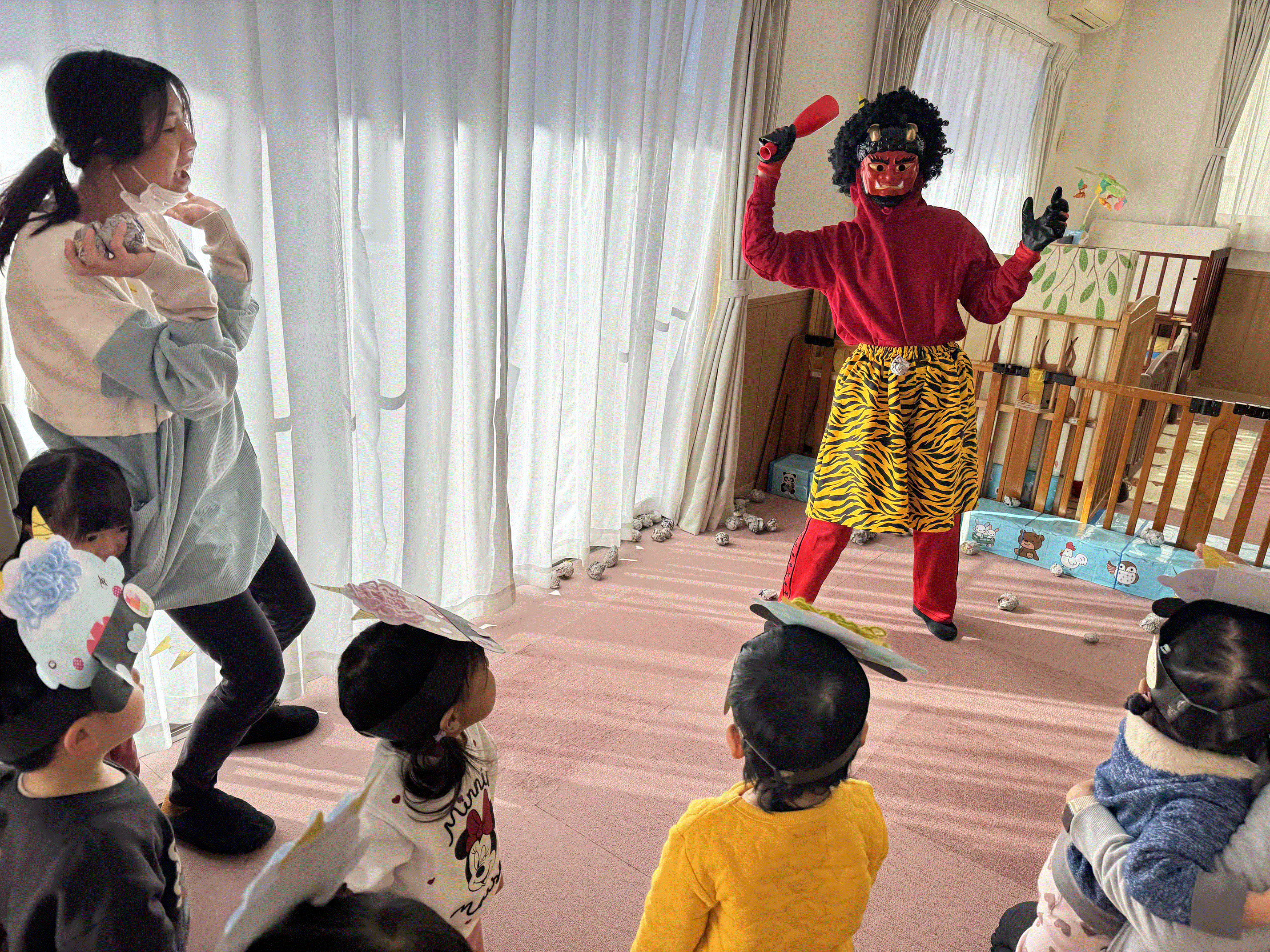 保育園で豆まき会を行いました😊豆まきのお話のパネルシアターを観たり、手作りのお面をかぶって『鬼のパンツ♪』を踊ったり、みんなで節分の行事を楽しみました✨鬼が登場すると驚いた様子でしたが、「鬼は外~!福は内~!」と新聞紙の豆を投げ、鬼が去り福の神がやってくると笑顔を見せてくれた子どもたちです🎵その後お菓子拾いもにこにこで参加し、お楽しみ給食のかわいい鬼ランチ👹も美味しく食べ、節分の行事を楽しく過ごしました🌟