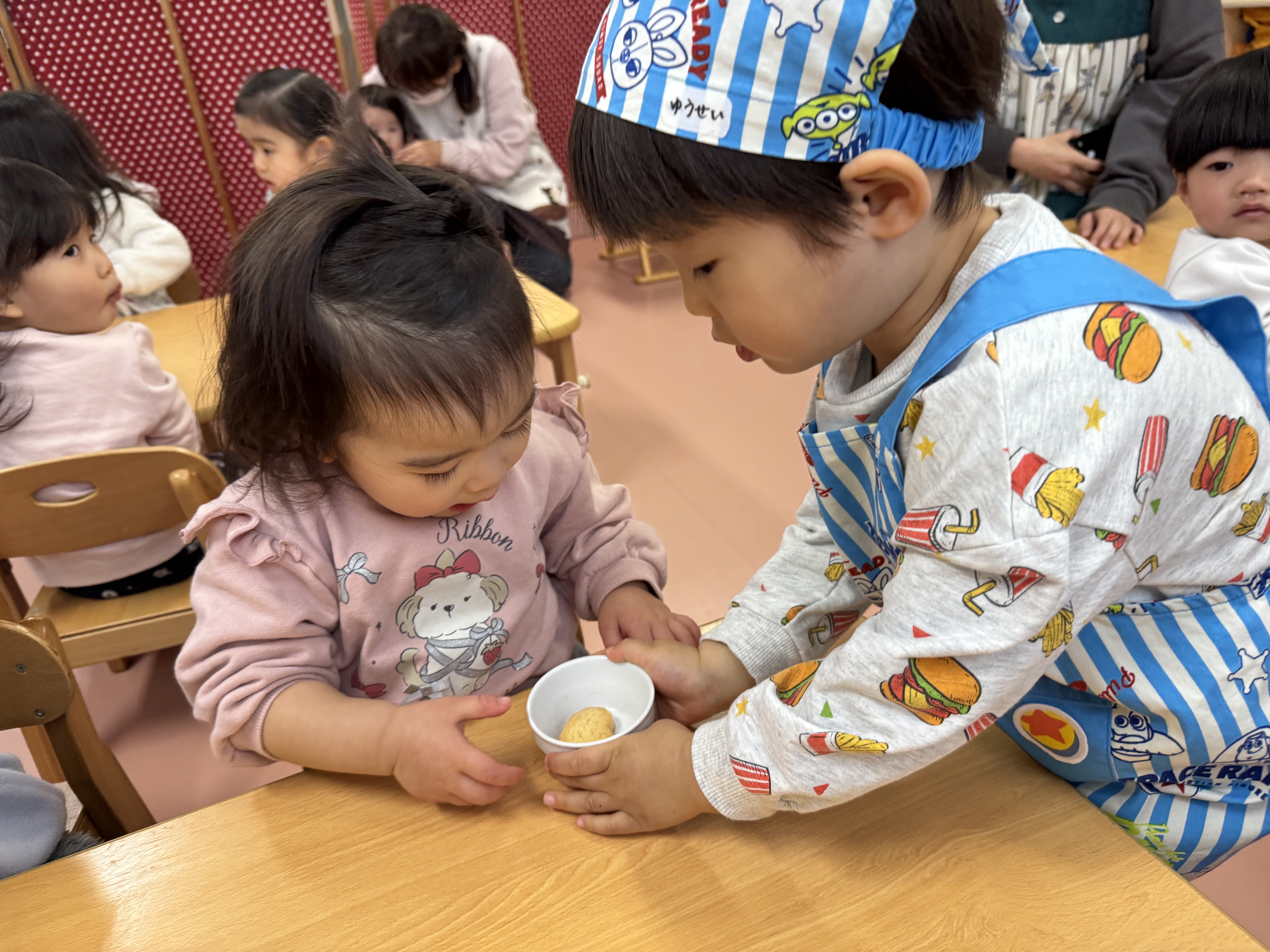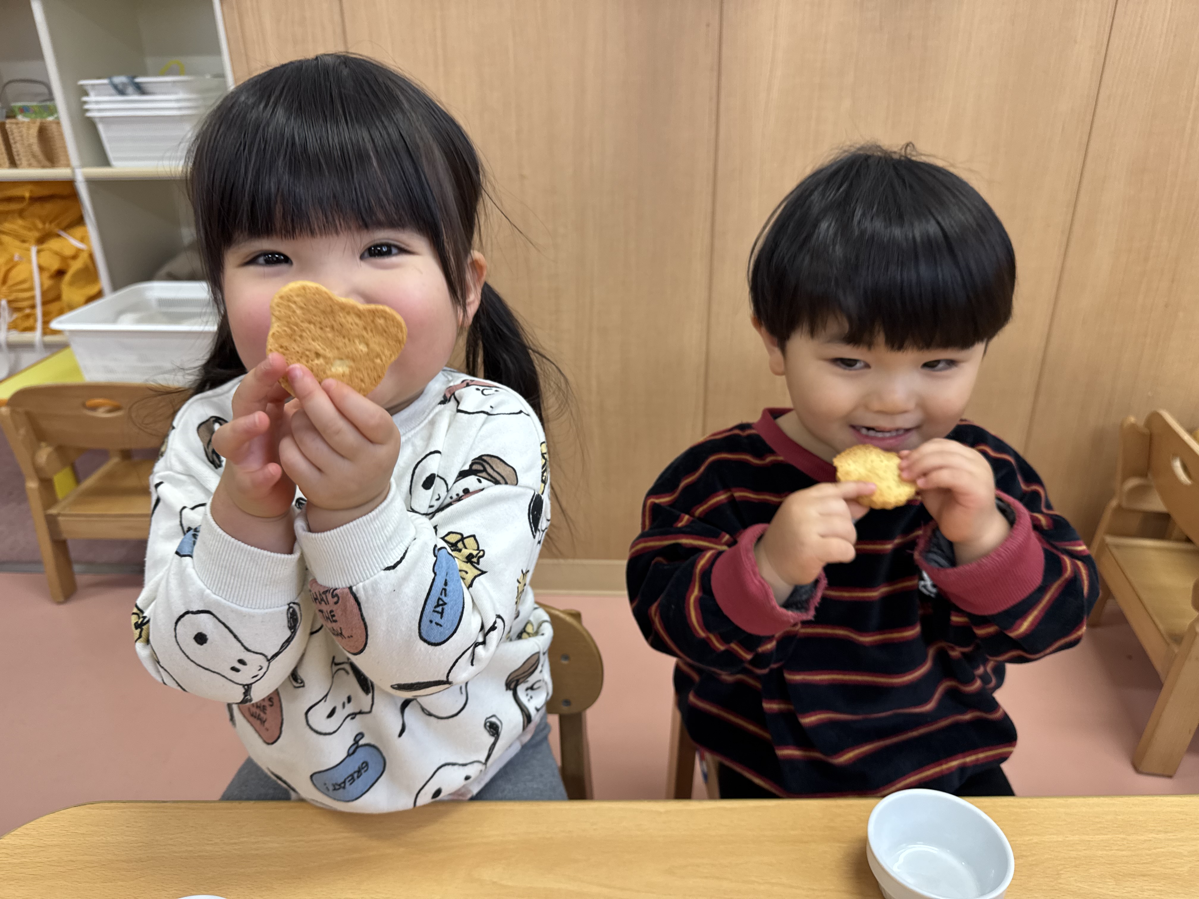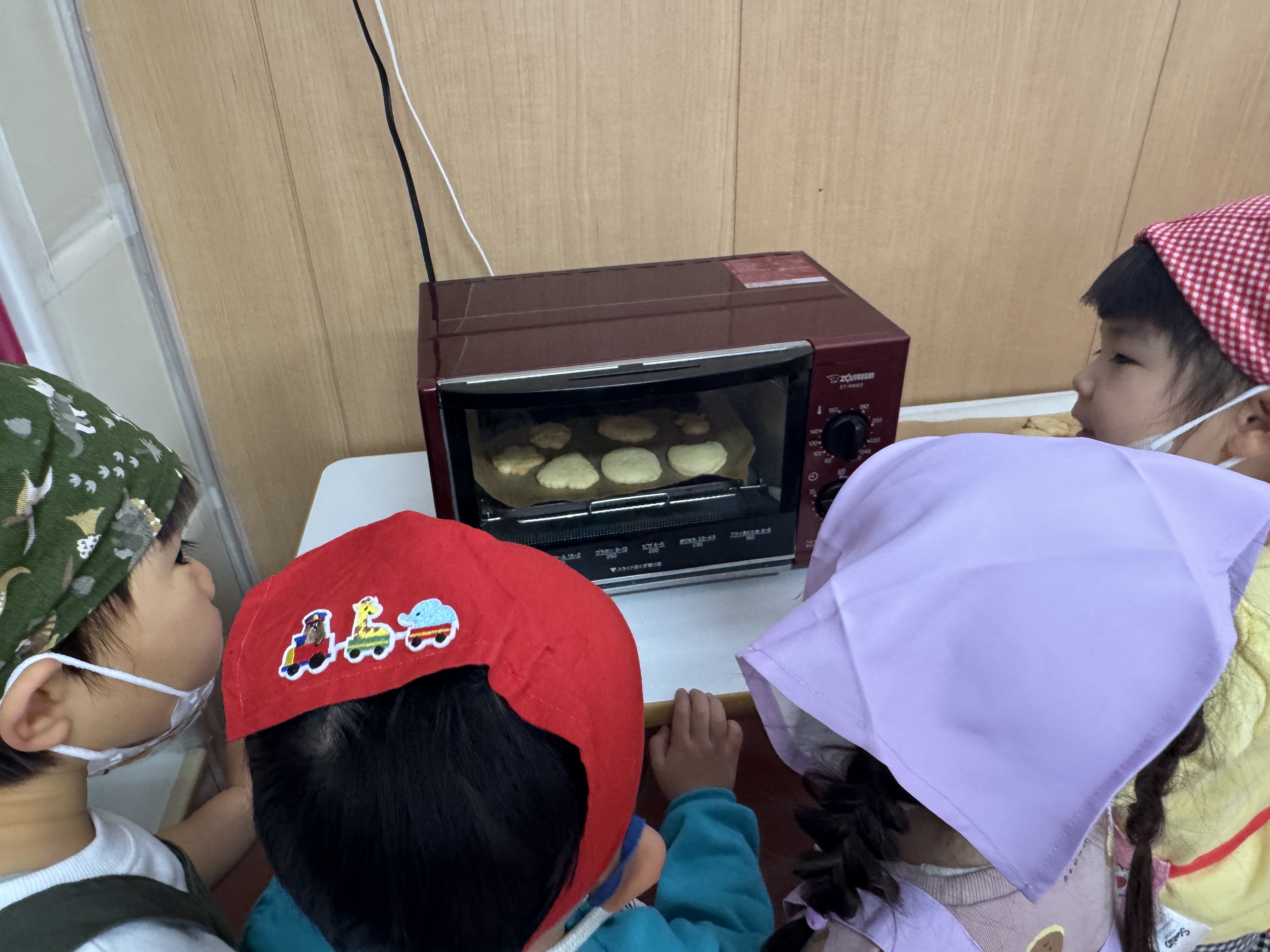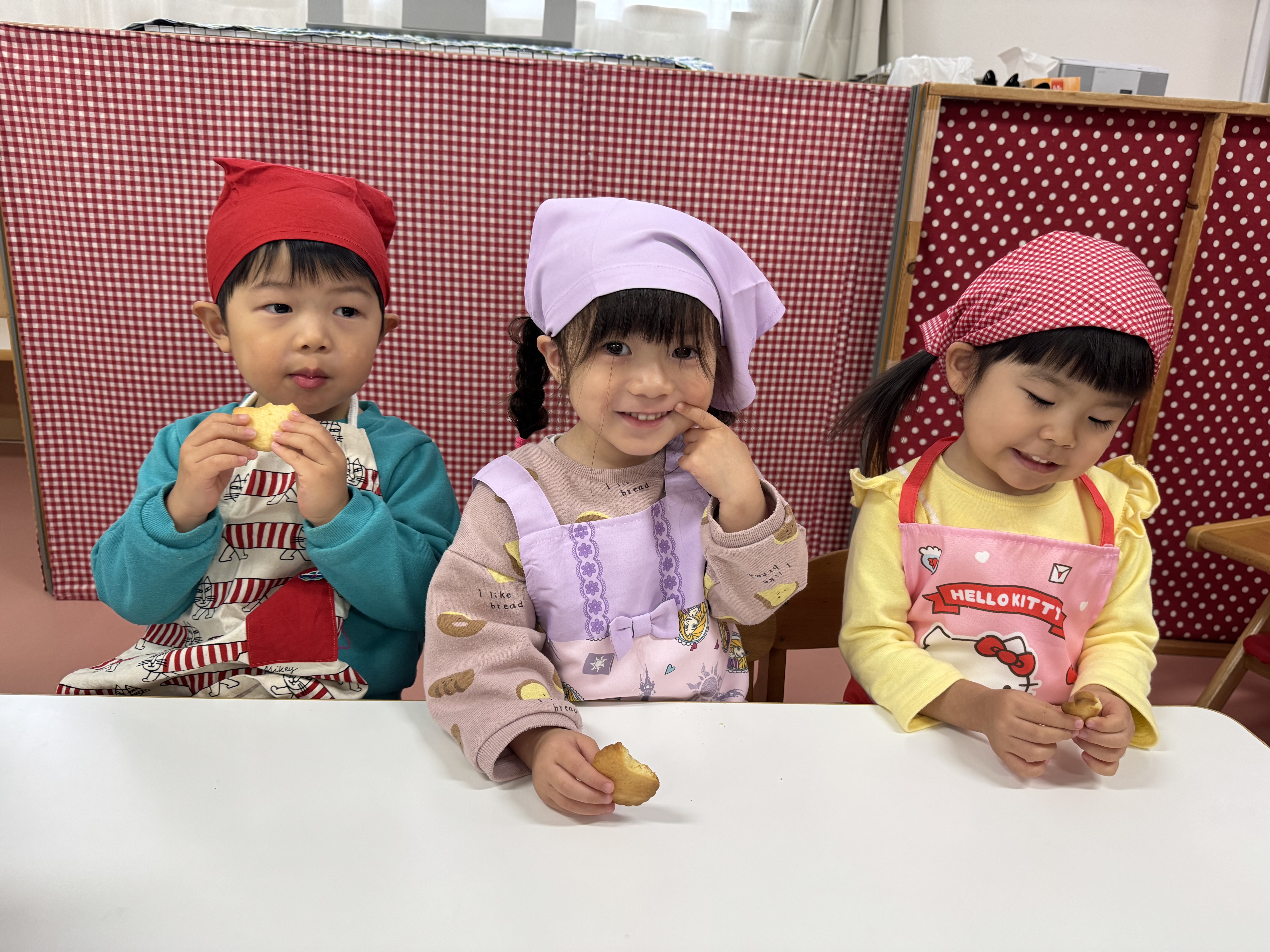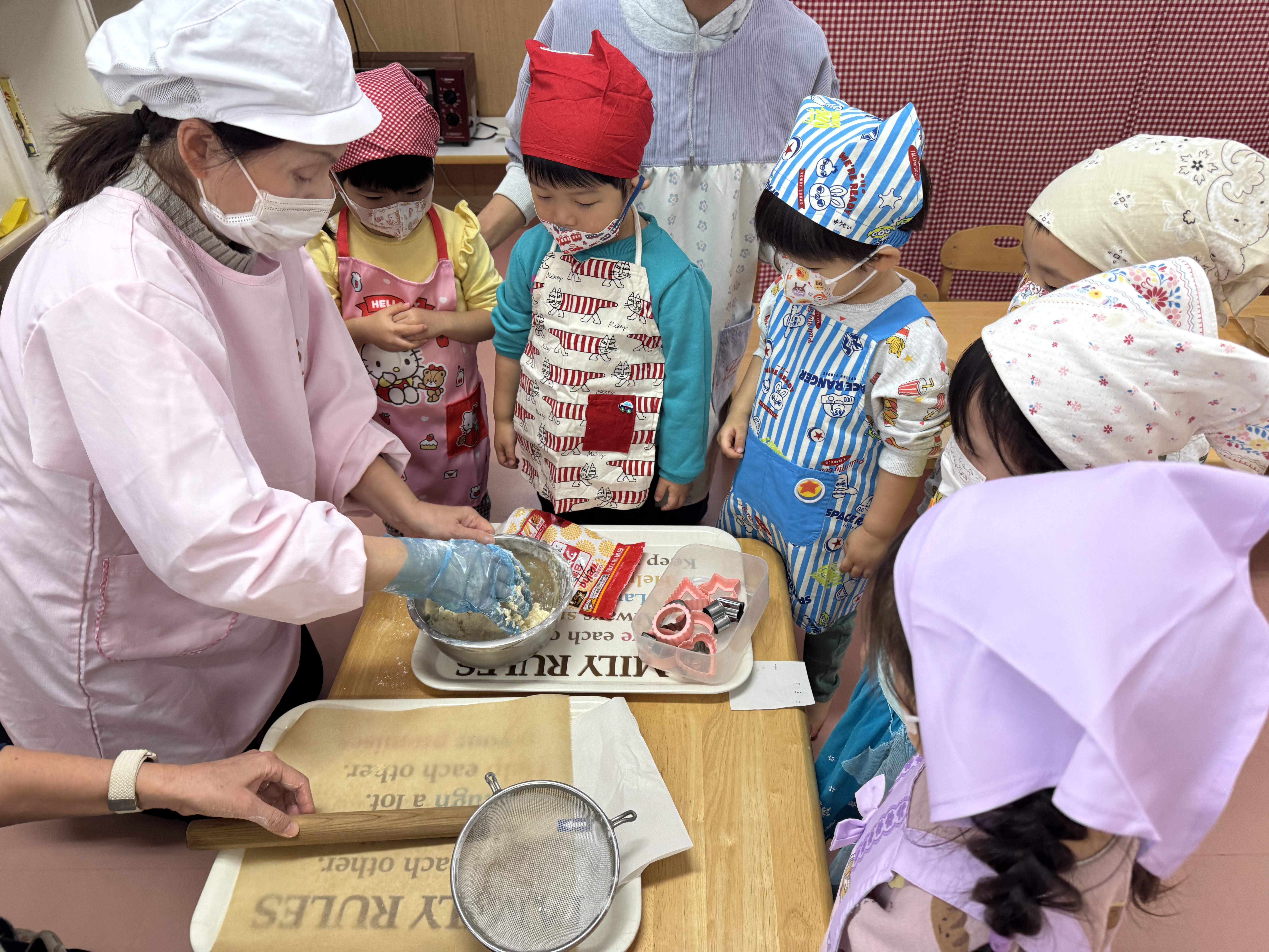 前日から粘土で型抜きの練習をしたり、クッキーの絵本を見てとても楽しみにしていた子ども達。調理員さんが材料を紹介し、作り方を教えてくれた時には興味津々な様子で見ていました✨クッキーを伸ばしたり型を抜いたり丸めたり・・色々なことに挑戦することができたにじ組さんです。出来立てのクッキーを食べた時の笑顔はとてもキラキラしていました‼️そら組さん、ひかり組さんにも手作りクッキーを手渡ししてみんなで一緒に楽しい時間を過ごしました😊