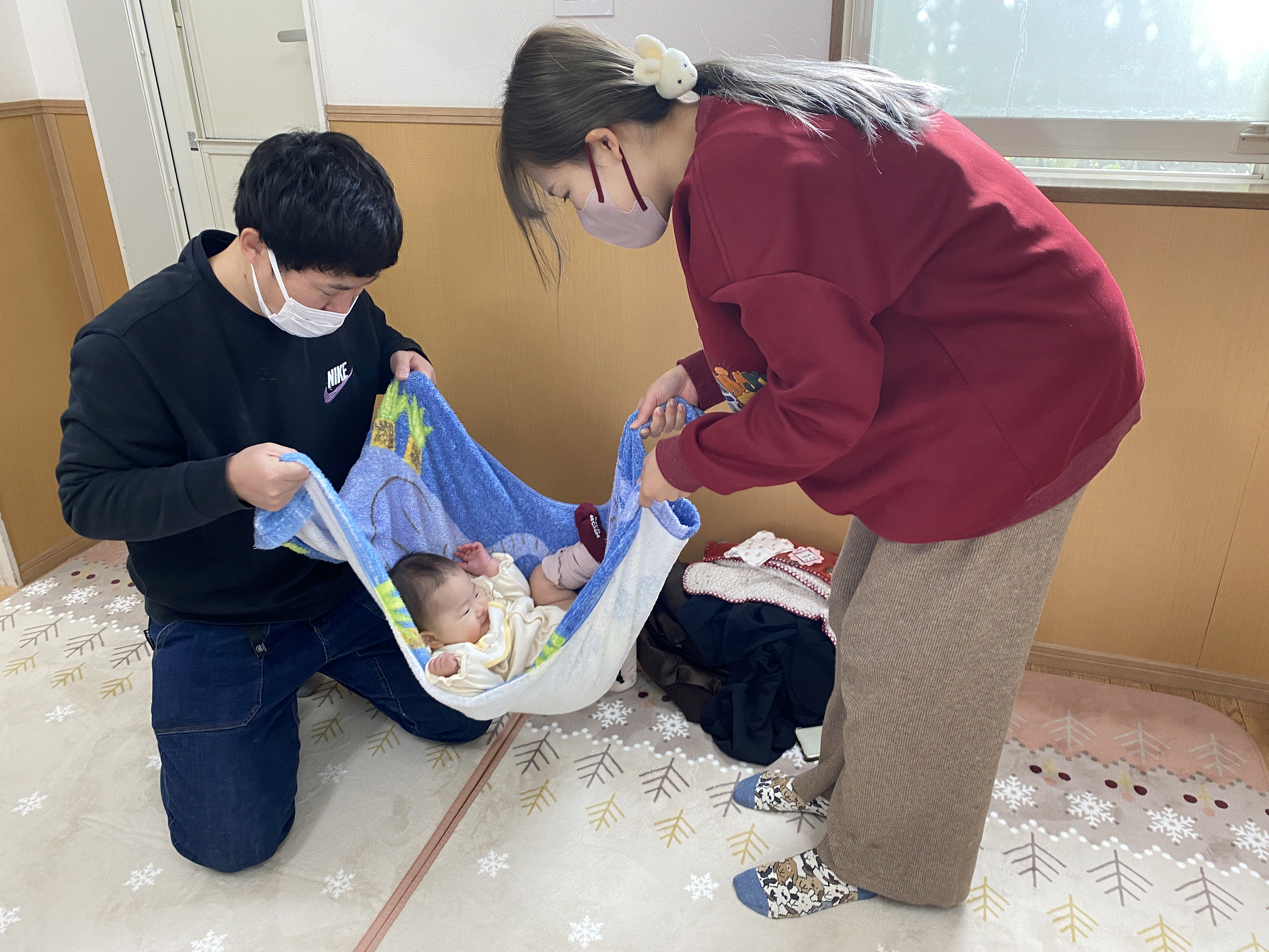 パパママブランコや、タオルを使ったハンモックなど体幹やバランスを育てるいろんなふれあい遊びを行いました😝