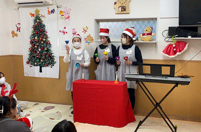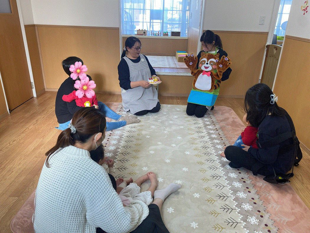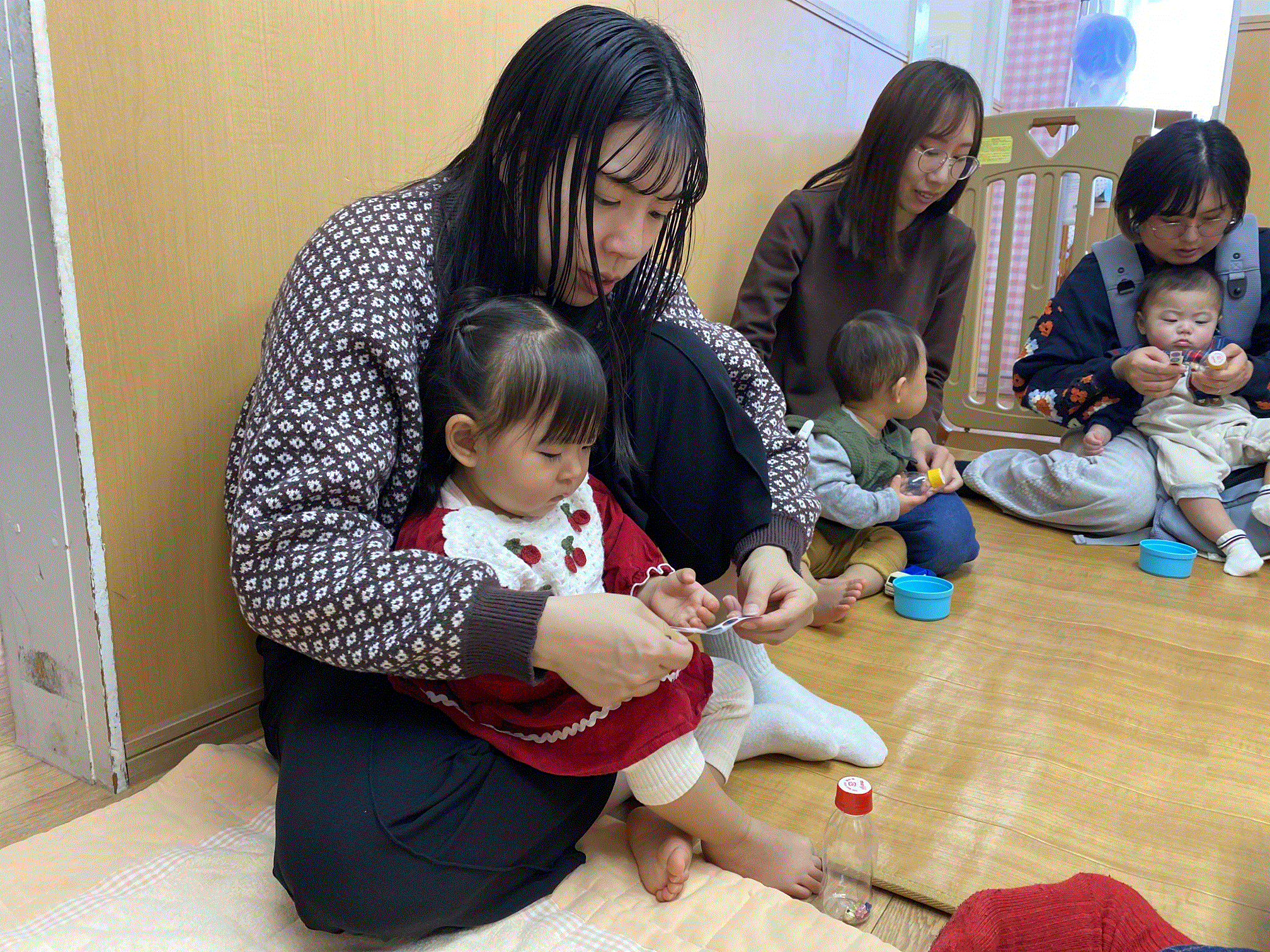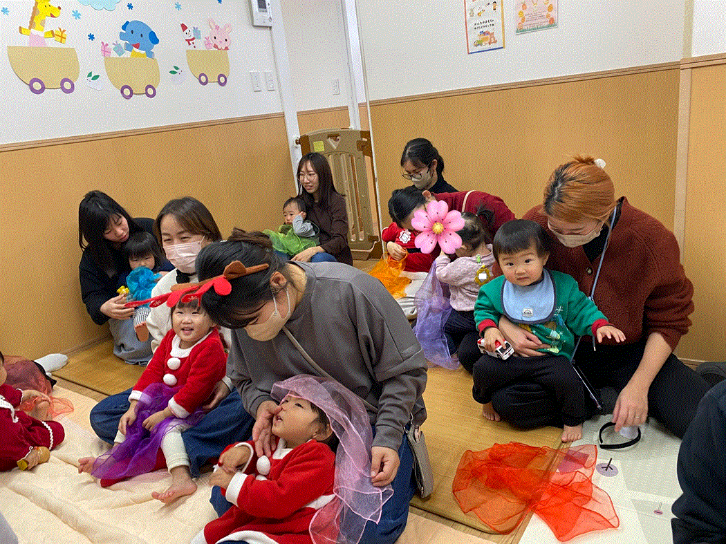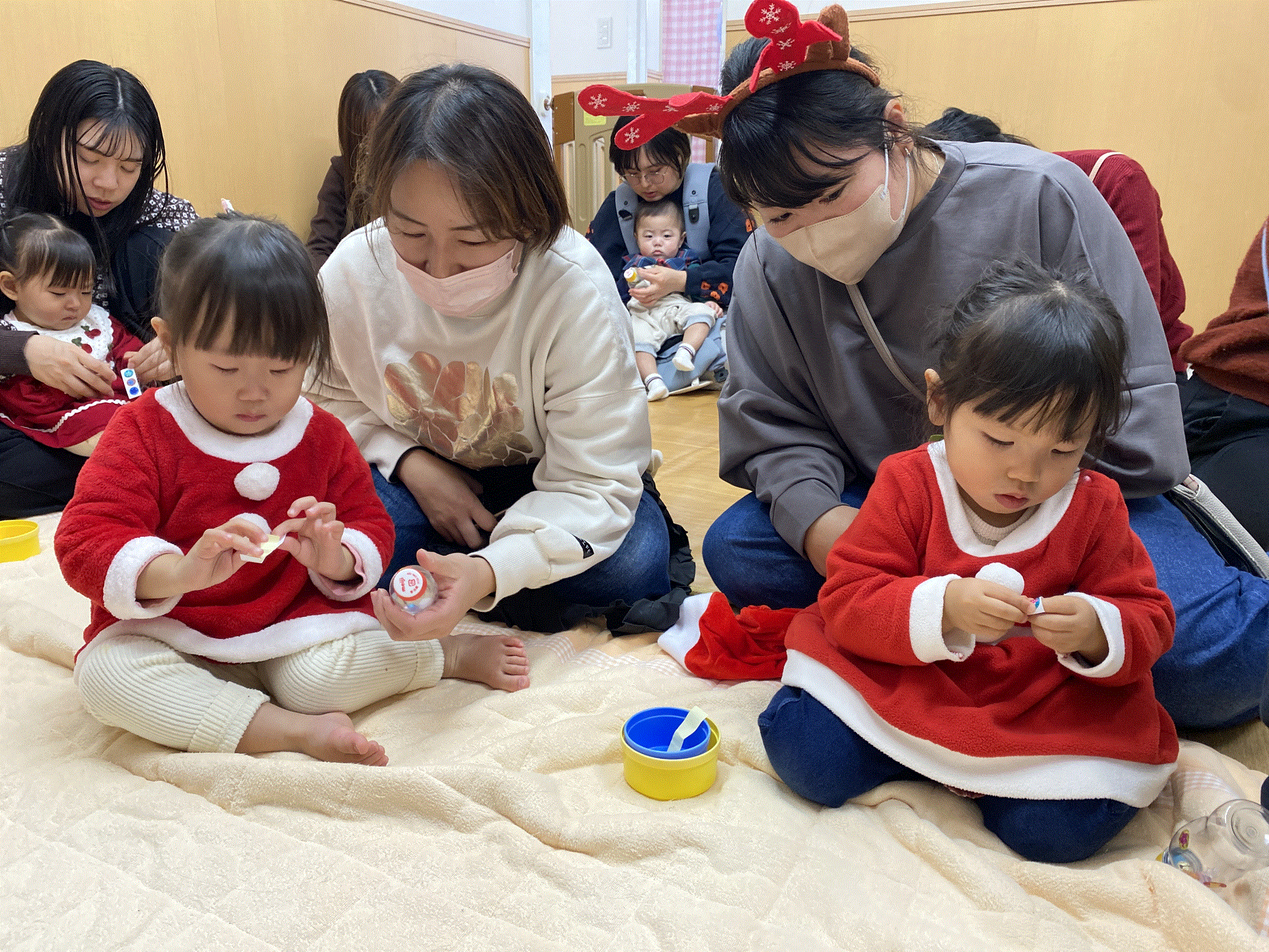 ベルの演奏やクリスマスソングに合わせてのふれあい遊び、パネルシアター、最後は自分で作ったシャカシャカで、『あわてんぼうのサンタクロース』を演奏しました。ママも子どもたちもにっこにこ🤗一足早いクリスマスを楽しみました🎄